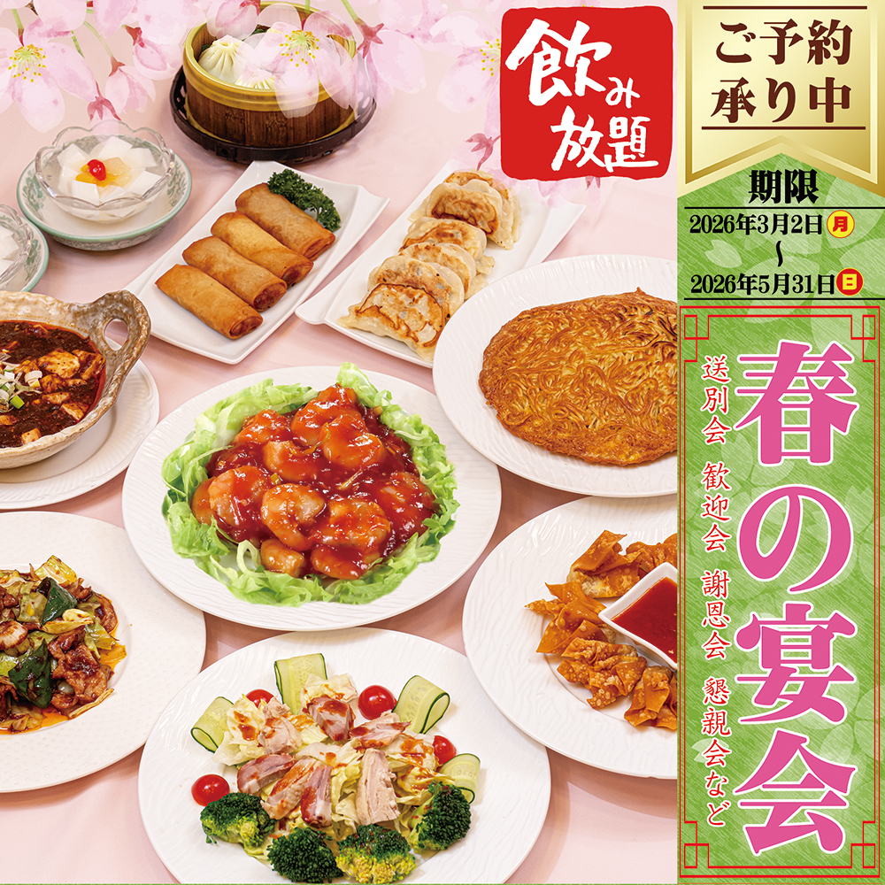 「エビチリ」や「麻婆豆腐」などの定番メニューに加え、当店の名物料理「梅蘭焼きそば」などを含む全10品+2時間飲み放題が付いた今だけのお得なコース内容になっております。送別会・歓迎会・各種宴会などにご利用くださいませ。 |